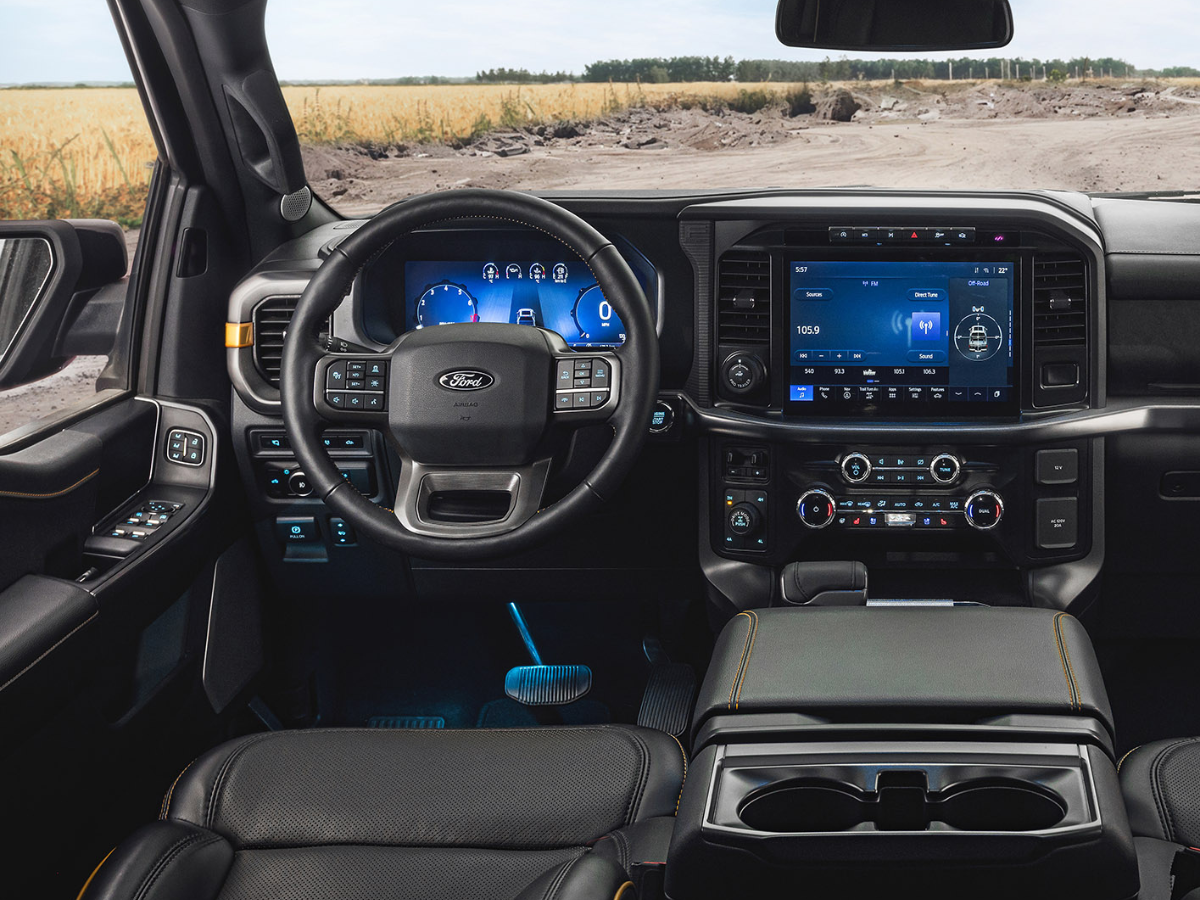 A nova picape vem completa, com quadro de instrumentos digital de 12 polegadas, multimídia SYNC 4 com tela de 12 polegadas e conexão com Apple CarPlay e Android Auto sem fio, head-up display e sistema de iluminação 360°. Tem também ar-condicionado dual zone, bancos climatizados e pedais com ajuste elétrico e memória, sistema de som B&O, manopla de câmbio rebatível, superfície de apoio no console, porta-objetos sob o banco traseiro com chave e tampa traseira multiacesso com sistema Pro Access.