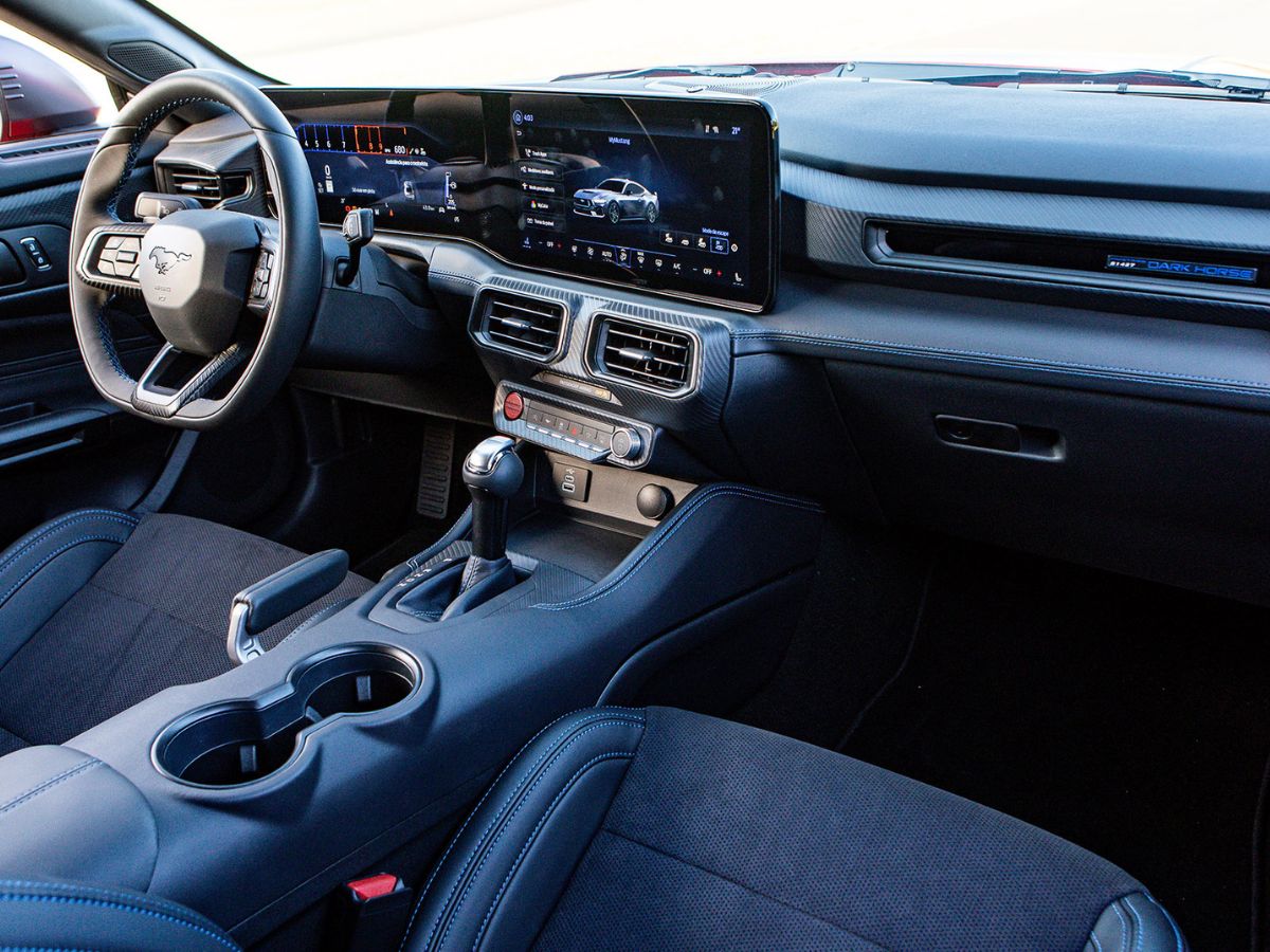 A cabine do Mustang Dark Horse é totalmente centrada no motorista e no estilo cockpit. O painel de instrumentos digital de 12,4 polegadas configurável forma um conjunto integrado com a tela de 13,2 polegadas da central multimídia. Além de conexão sem fio com Android Auto e Apple CarPlay e GPS embarcado, ela vem com sistema de som premium da B&O e 12 alto-falantes.
