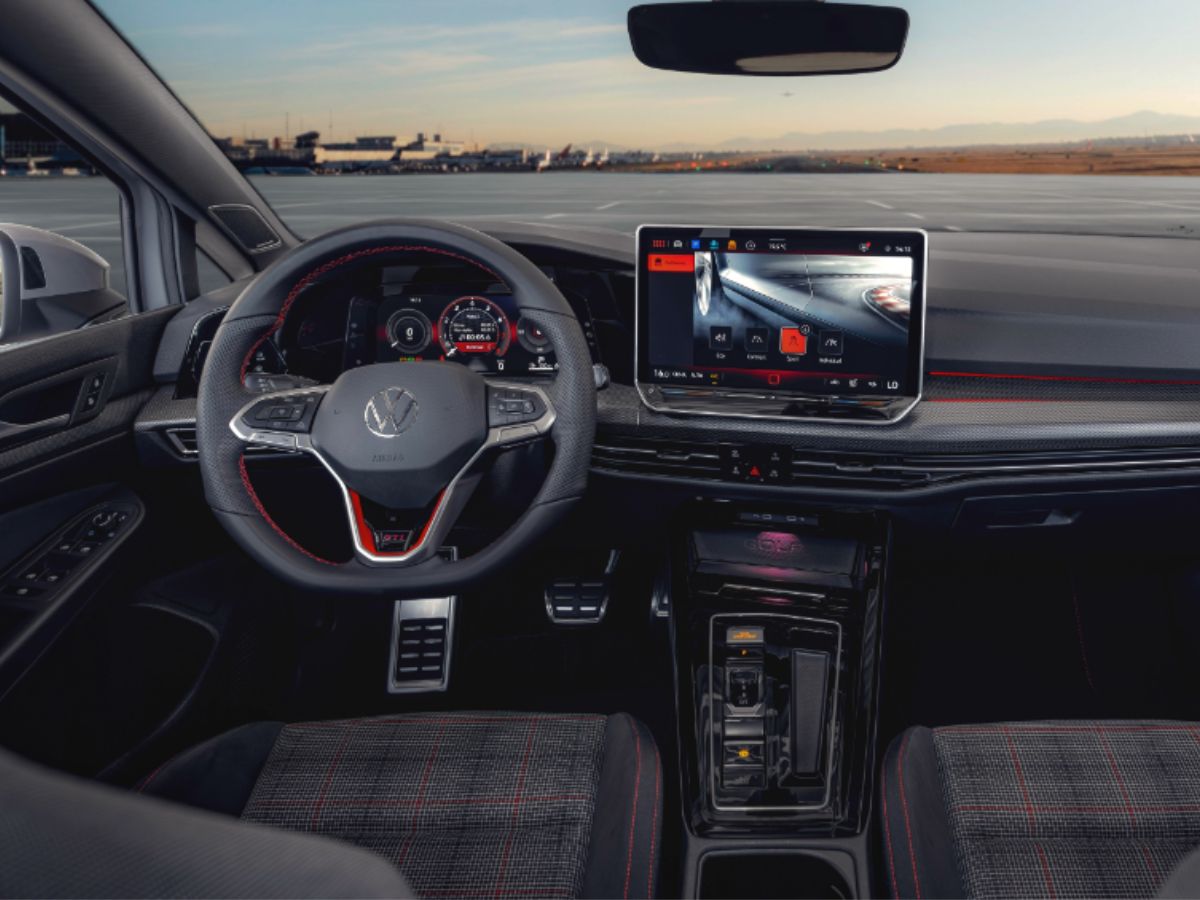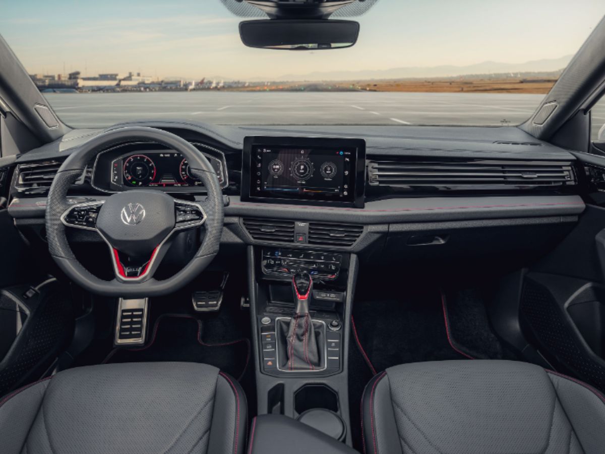 O painel de instrumentos Digital Cockpit Pro de 10,2 polegadas oferece três novos modos de visualização, com destaque para funções esportivas para marcação da pressão de turbina, potência do motor, força G, entre outros. O volante capacitivo para as funções de ADAS retorna aos botões físicos para o motorista e trás acabamento perfurado, costuras vermelhas, badge GTI na base e aquecimento.