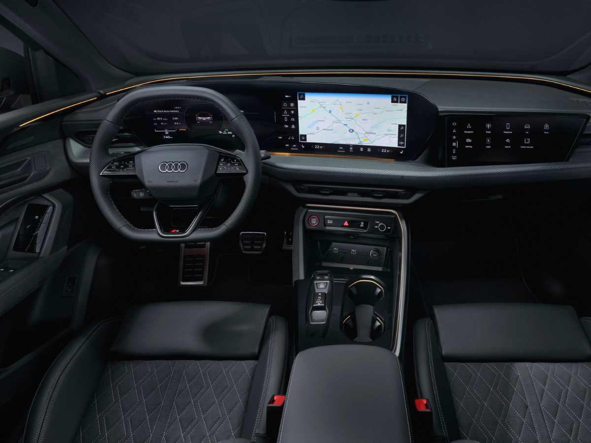 Internamente, a cabine conta com o display panorâmico MMI-touch de 14,5 polegadas com navegador integrado, e o painel de instrumentos digital Audi Virtual Cockpit de 11,9 polegadas. Há diferentes modos de condução por meio do Audi Drive Select, e o conforto a bordo é garantido pelos bancos conforto com apoios laterais reforçados, ajustes elétricos para motorista e passageiro, apoio lombar com ajustes elétricos em quatro vias e, por fim, apoio de braço central com ajuste de inclinação.