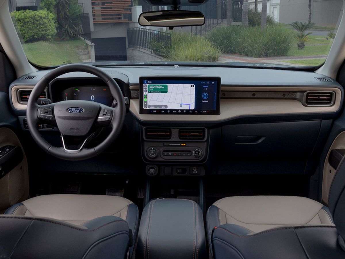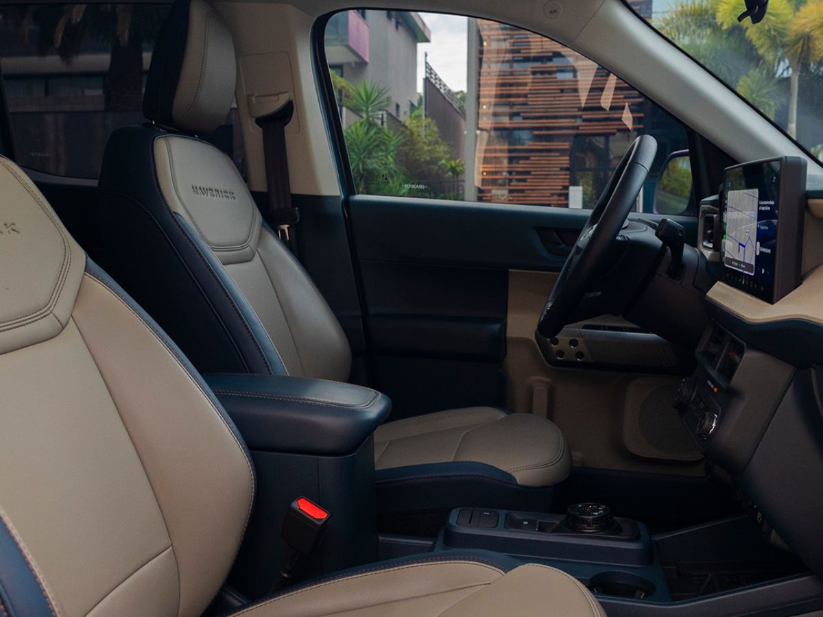 No interior, cores claras combinam com o azul e bege e o nome Maverick estampado nos bancos, juntamente com o teto solar elétrico. São novidades também o painel de instrumentos de 8 polegadas e a central multimídia SYNC 4 com tela de 13,2 polegadas, GPS embarcado e conexão com Apple CarPlay e Android Auto sem fio. A cabine oferece soluções inteligentes de aproveitamento de espaço para acomodar diferentes objetos, como laptop, celular, equipamentos e um exclusivo compartimento de 56 litros sob o banco traseiro.